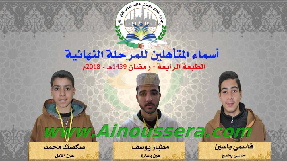 احتضن مسجد الامام ” مالك بن انس ” بعين وسارة صبيحة اليوم الدور التصفوي الثالث لجائزة المرحوم الحاج ” طالب سليمان ” لحامل كتاب الله في طبعتها الرابعة، حيث امتحنت لجنة التحكيم 07 مترشحين أفرزهم الدور التصفوي الثاني من أجل اختيار 03 حفظة ممن سينشطون الدور النهائي ليلة السابع والعشرين من شهر رمضان لسنة 1439 هـ / 2018 م.