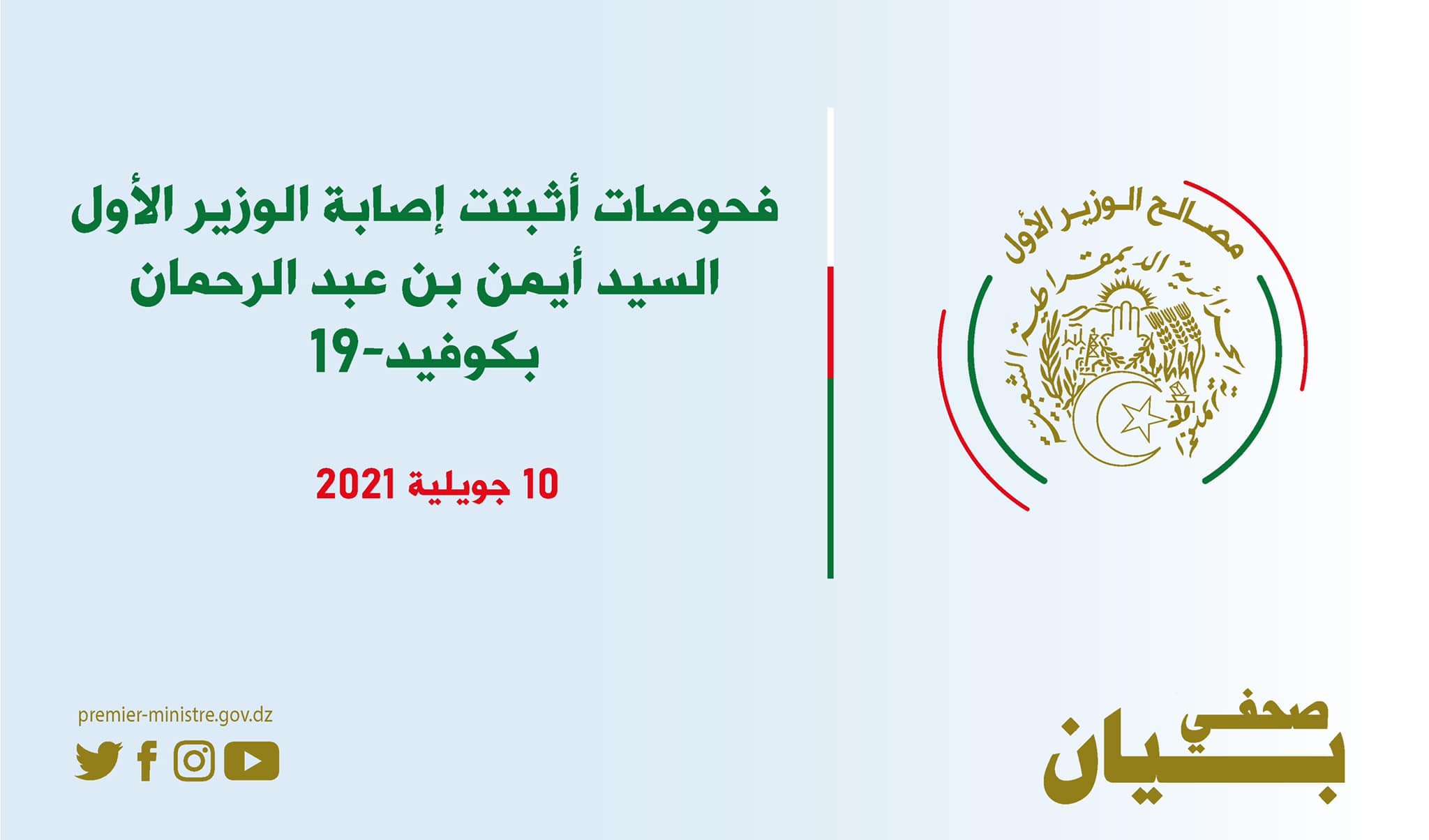 وفقاً للتعليمات الطبية، دخل السيد الوزير الأول في حجر صحي مدته (7) أيام ابتداءً من اليوم، مع فحص آخر عند نهاية المدة
