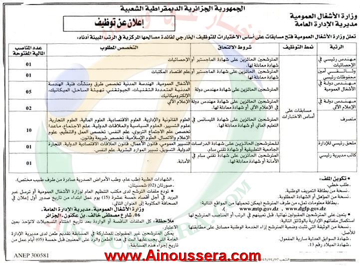 تم هذا اليوم 2015/01/07 الاعلان عن مسابقة توظيف بوزارة الاشغال العمومية بجريدة الشعب
