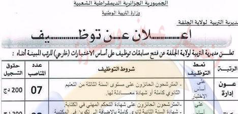 أعلنت مديرية التربية لولاية الجلفة عن فتح مسابقة على أساس الاختبارات لـ : 21 منصب لشغل وظائف عون مكتب وكاتب وكاتب مديرية وعون حفظ بيانات.