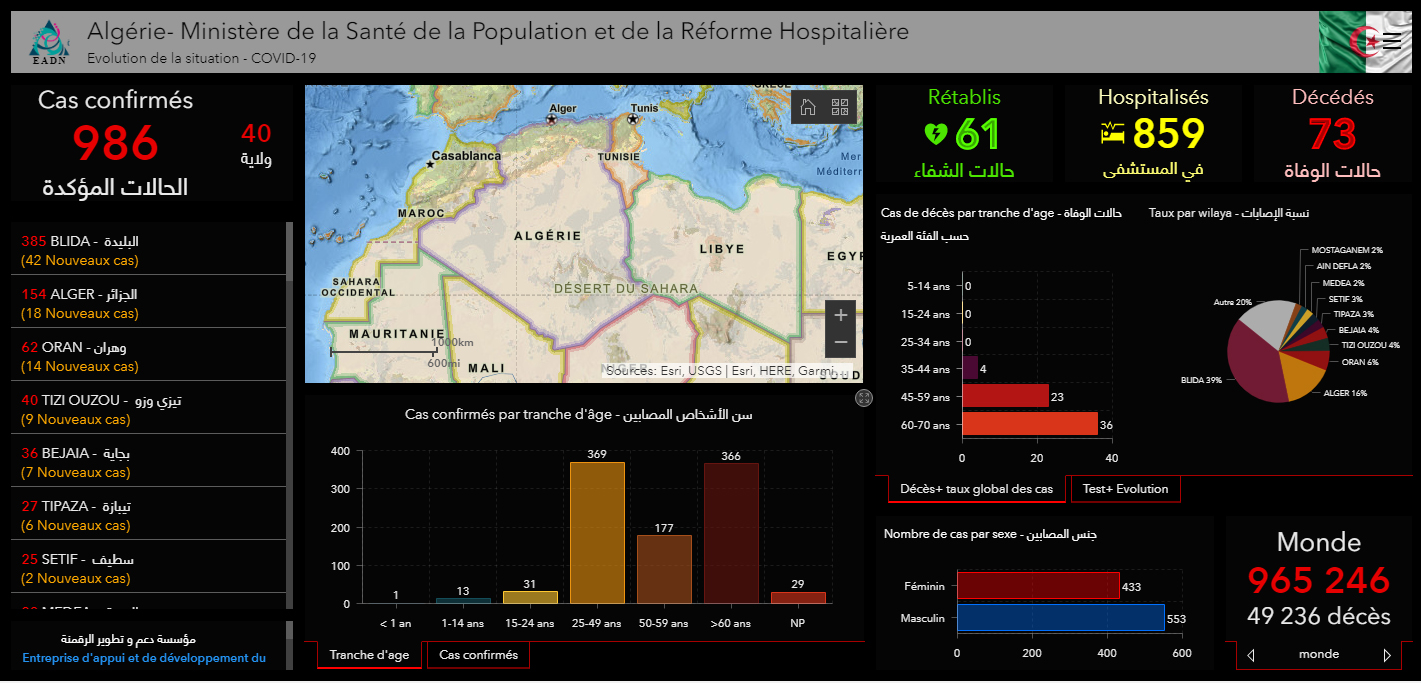 أعلنت وزارة الصحة عن ارتفاع عدد المصابين بفيروس كورونا المستجد Covid -19 إلى 986 شخصاً في الجزائر بعد تسجيل إصابات جديدة، اليوم الخميس عبر 40 ولاية.