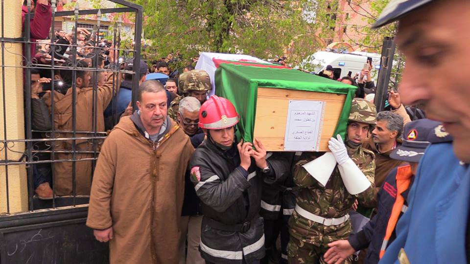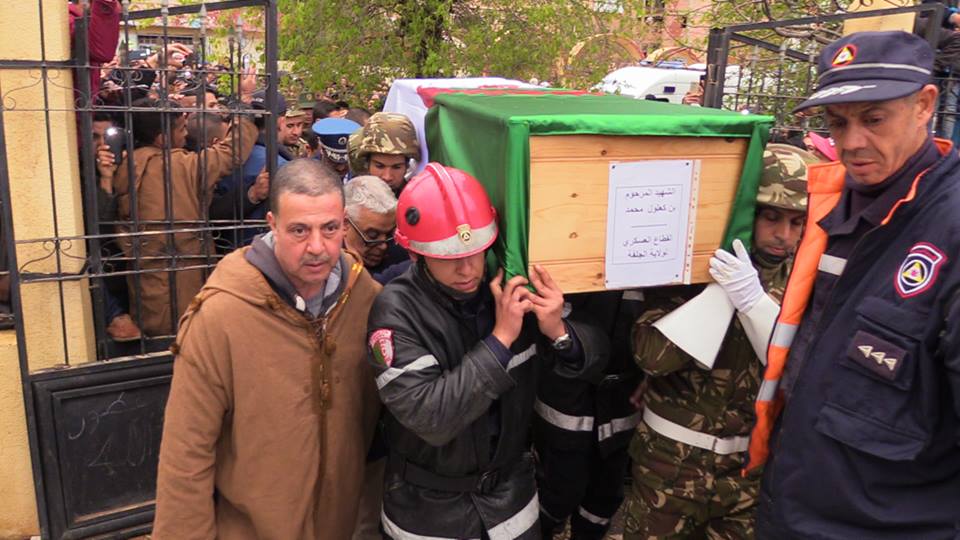 ألقى سكان الجلفة أمسية اليوم بوسط المدينة النظرة الأخيرة على جثمان الشهيد ” بن كعلول محمد ” ابن مدينة مسعد الذي استشهد اثر تحطم الطائرة العسكرية ببوفاريك وقد كانت الحصيلة استشهاد 257 شهيدا.