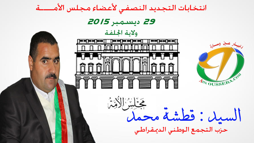 أسفرت نتائج الفرز الخاصة بانتخابات التجديد النصفي لمجلس الأمة عن ولاية الجلفة ، فوز مرشح التجمع الوطني الديمقراطي السيد ” قطشة محمد ” رئيس بلدية عمورة ، حيث جرت أطوار هذه الانتخابات يوم 29 ديسمبر 2015 بقاعة المحاضرات لولاية الجلفة والتي ترشح لها 04 وكان التنافس محصورا بين مرشح حزب جبهة التحرير الوطني السيد ” بلخضر نعوم ” رئيس المجلس الشعبي الولائي والسيد ” قطشة محمد “.