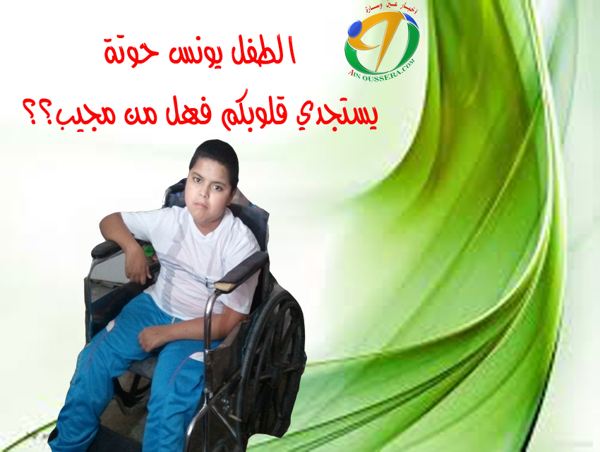 هي استغاثة طفل بريء الى ذوي القلوب الرحيمة ، قصد مساعدته لتجميع مبلغ تكاليف علاجه ، هو الطفل حوتة يونس صاحب 13 سنة أصيب بإعاقة على مستوى أطرافه اطرافه بعدما كان صحيح معافى في السنين الأولى من عمره وهذا بسبب مرض الوهن العضلي ، وهو الان يحتاج لعملية جراحية عاجلة .