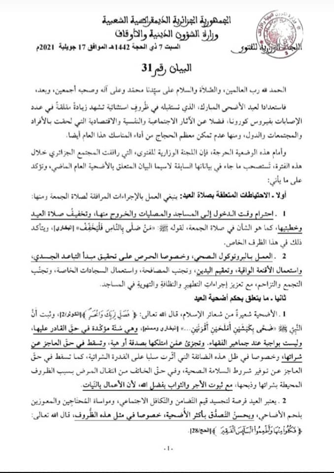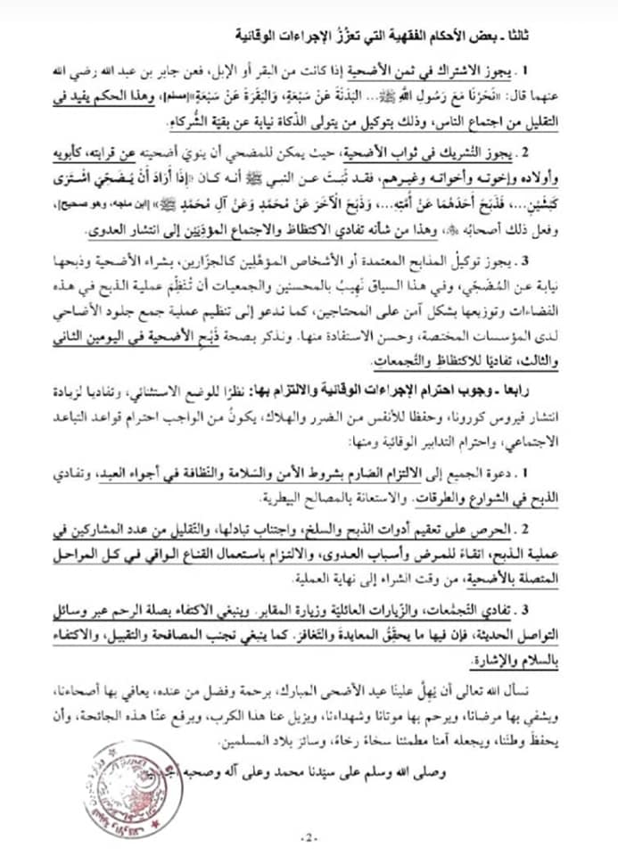 وأمام هذه الوضعية الحرجة، فإن اللجنة الوزارية للفتوى، التي رافقت المجتمع الجزائري خلال هذه الفترة، تَستصحب ما جاء في بياناتها السابقة لاسيما البيان المتعلق بالأضحية العام الماضي، وتؤكد على ما يأتي: