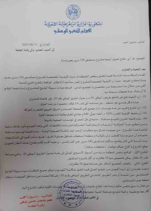 راسل النائب باسين أحمد والي ولاية الجلفة من أجل تغيير الأرضية المخصصة لانجاز مستشفى 120 سرير الموجودة بالمخرج الغربي للمدينة ، كون الأرضية الحالية غير ملائمة لاقامة هذا المشروع لعدة اعتبارات ذكرها النائب في مراسلته كضيق المساحة وقربها من عدة منشأت لا تضمن الراحة والسكينة للمرضى كالسوق الجهوي ومحطات خدمات والمجمع السكني المحاذي للارضية.