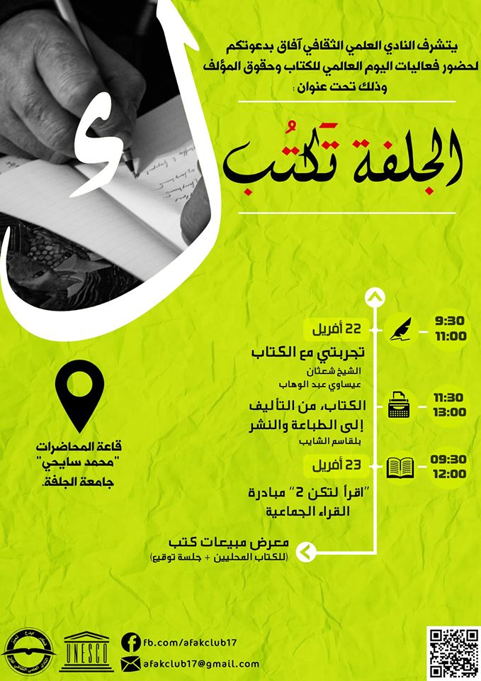 ينظم النادي العلمي آفاق نشاط بعنوان ” الجلفة تكتب ” وسيكون النشاط على يومين.