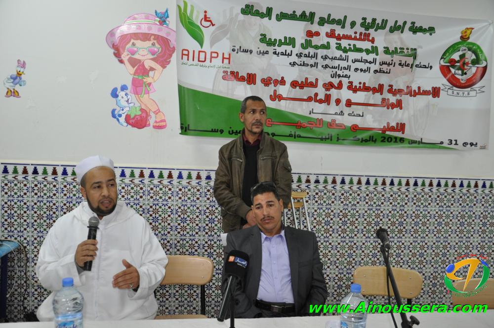 احتضن المركز النفسي البيداغوجي بعين وسارة صبيحة اليوم يوما دراسيا نظمته جمعية الأمل لادماج وترقية الشخص المعاق بالتنسيق مع النقابة الوطنية لعمال التربية تحت عنوان ” الاستراتيجية الوطنية في تعليم ذوي الاعاقة ..الواقع والمأمول ” ، وذلك بحضور رئيس المجلس الشعبي البلدي وأئمة وممثلي الأسرة التربوية ومختصين في علم النفس وممثلي المجتمع المدني وعدد من جمعيات ذوي الاحتياجات الخاصة.