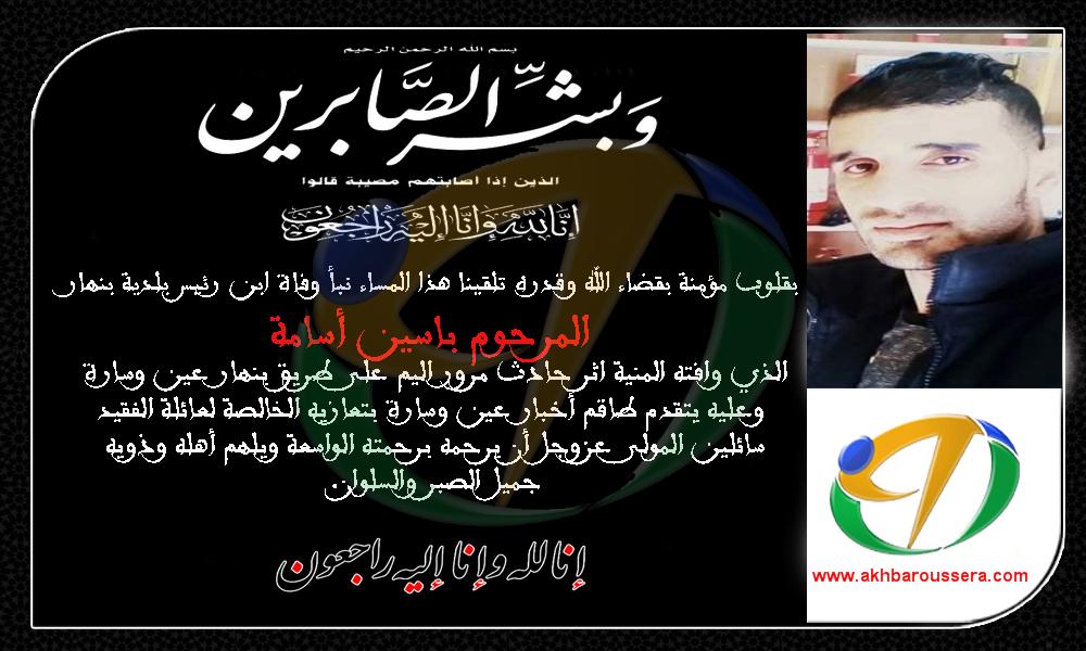 توفي أمسية اليوم ابن رئيس بلدية بنهار اثر حادث مرور اليم ، حيث توفي المرحوم ” أسامة باسين ” في عين المكان بينما تم نقل أخيه الذي كان برفقته لمستشفى البليدة.