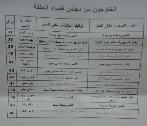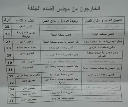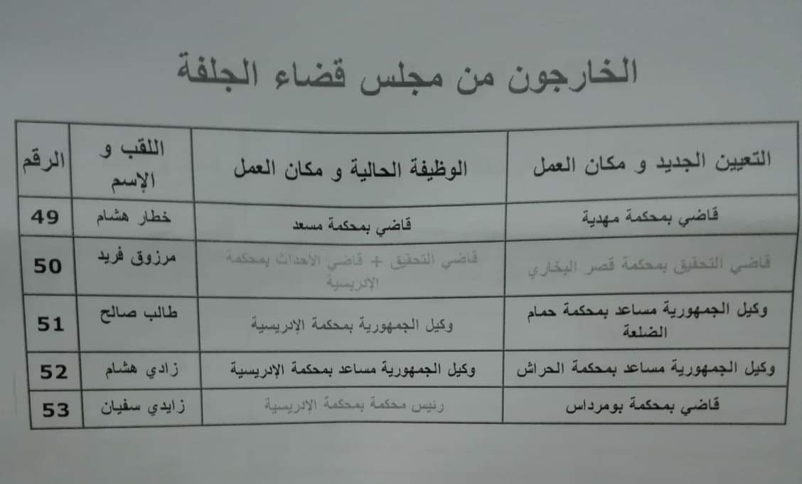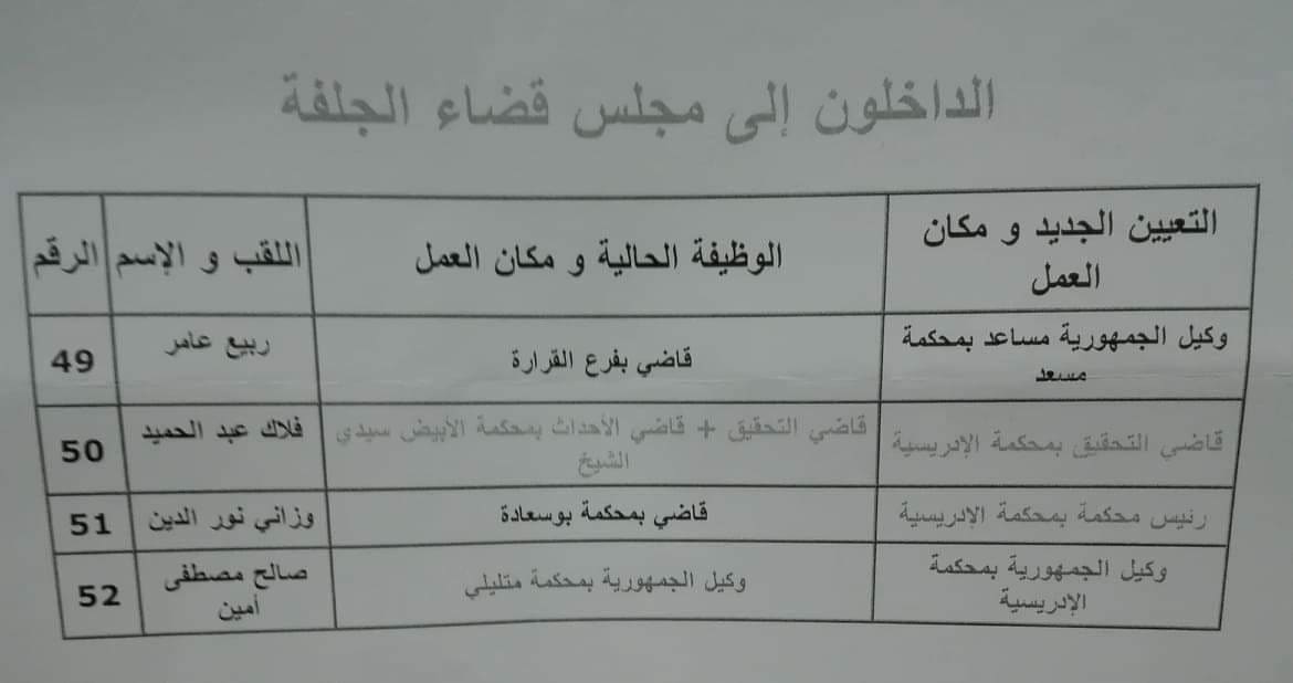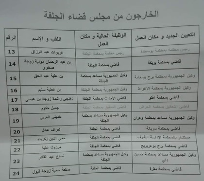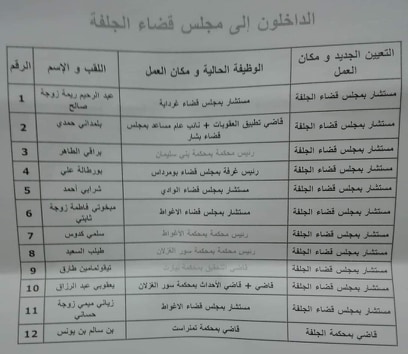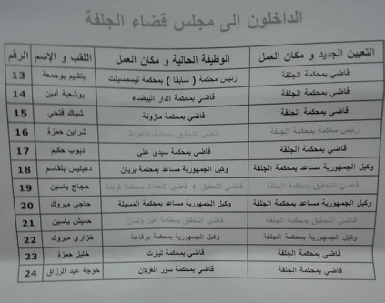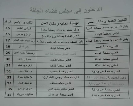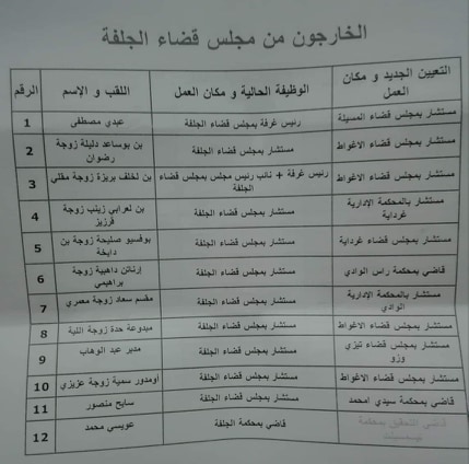 وحسب المعلومات التي تحصلت عليها أخبار عين وسارة فقد تم تعيين السيد ” بن خاوة جلول ” كوكيل للجمهورية بمحكمة عين وسارة القادم اليها من مجلس قضاء تيبازة خلفا للسيد ” شيكاوي سمير ” المحول الى محكمة الحراش ، كما تم تعيين السيد ” بوشليق كمال ” كرئيس لمحكمة عين وسارة القادم اليها من محكمة سطيف خلفا للسيد ” ضويفي عادل ” المحول لنفس المنصب بمحكمة مهدية بالاضافة لتحويل عدد من القضاء بمحكمة عين وسارة وعموم مجلس قضاء الجلفة.