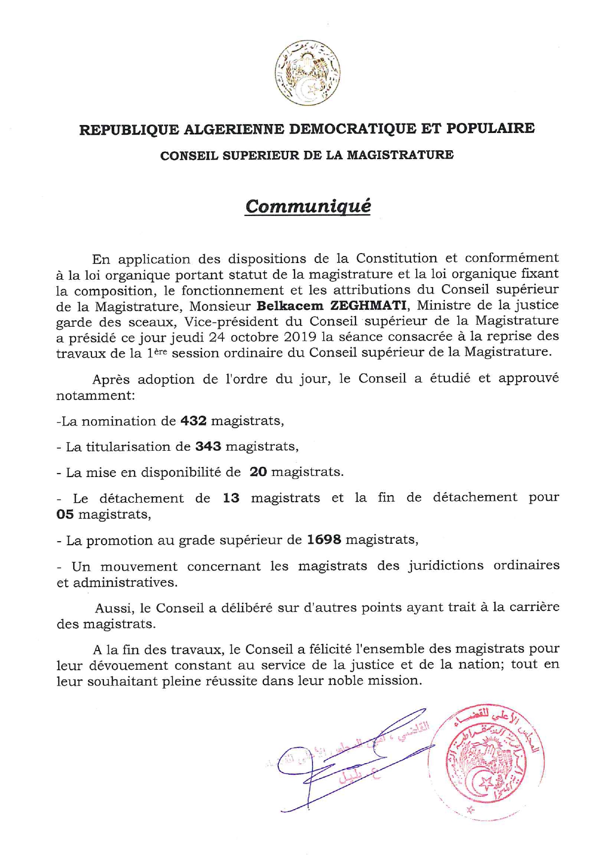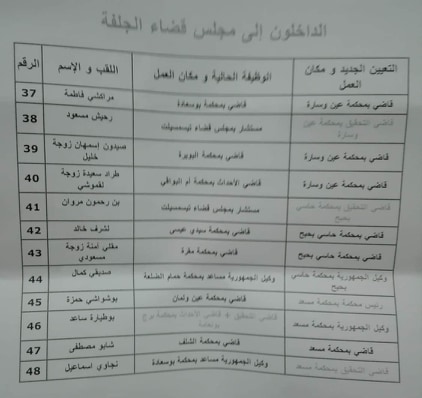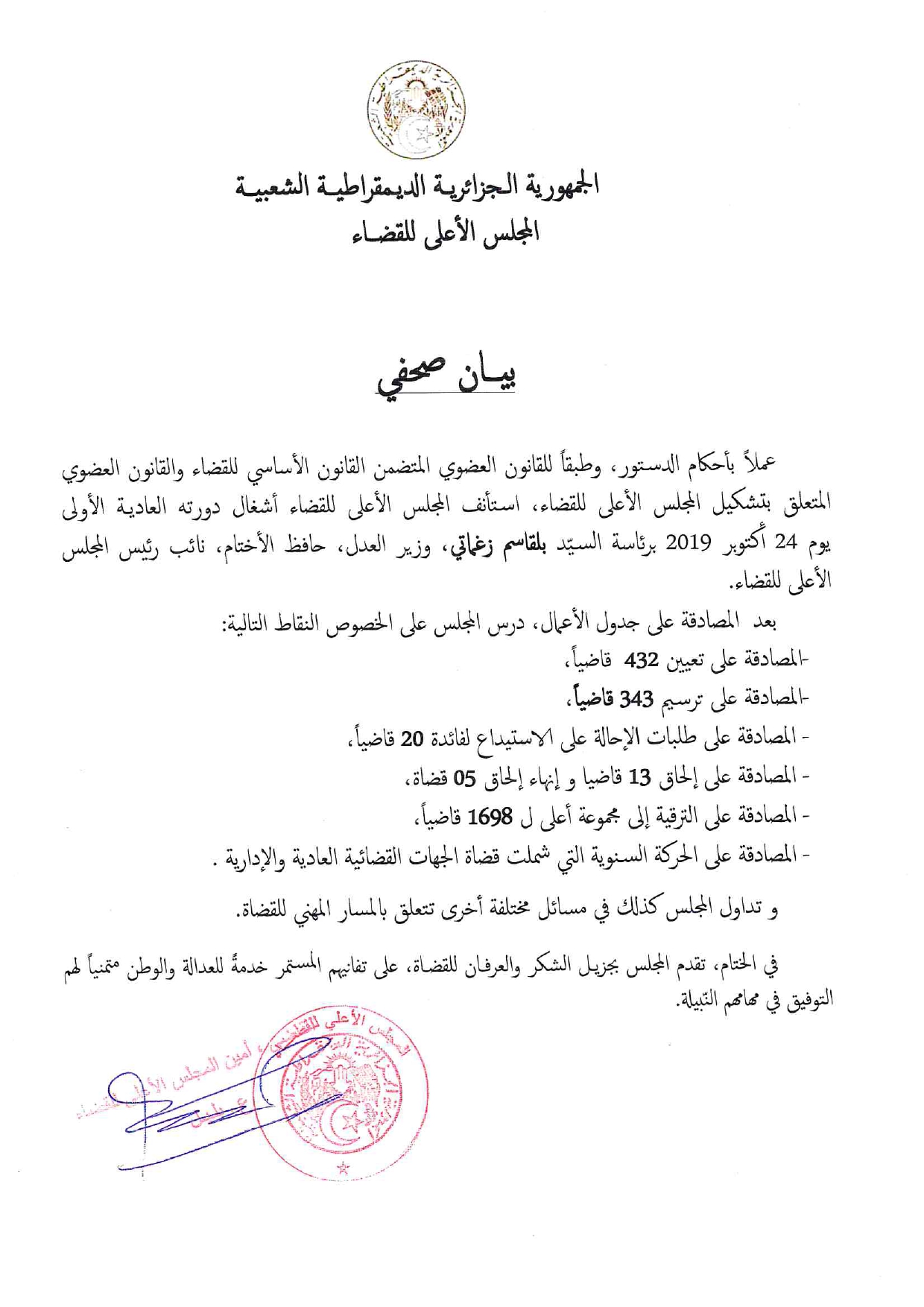 تبعا للقرارات التي أسفر عنها اجتماع المجلس الاعلى للقضاء في دورته العادة المنعقدة يوم الخميس 24 أكتوبر 2019 برئاسة السيد بلقاسم زغماتي وزير العدل حافظ الاختام ، نائب رئيس المجلس الاعلى للقضاء والتي تم على اثرها المصادقة على جدول الاعمال المتضمن المصادقة على الحركة السنوية التي شملت قضاة الجهات القضائية العادية والادارية والتي مست 2998 قاضيا.
