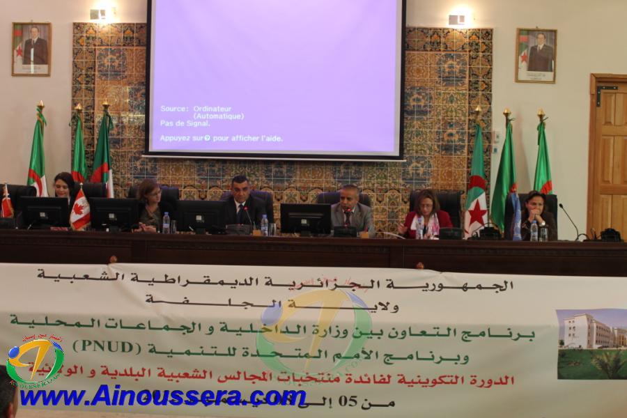 احتضن مقر المجلس الشعبي الولائي صبيحة اليوم دورة تكوينية لفائدة منتخبات المجالس الشعبية البلدية ومنتخبات المجلس الشعبي الولائي بالجلفة وذلك في إطار شراكة بين برنامج الأمم المتحدة للتنمية ( PNUD ) ووزارة الداخلية والجماعات المحلية ، حيث أشرف والي الولاية السيد ” عبد القادر جلاوي ” ورئيس المجلس الشعبي الولائي ” بلخضر نعوم ” على افتتاح هذه الدورة بمعية سفيرة كندا بالجزائر السيدة ” إيزابيل روا ” والسكرتيرة الأولى لسفارة النرويج بالجزائر ومديرة الحكامة المحلية بوزارة الداخلية والجماعات المحلية السيدة ” حمريط فتيحة “.