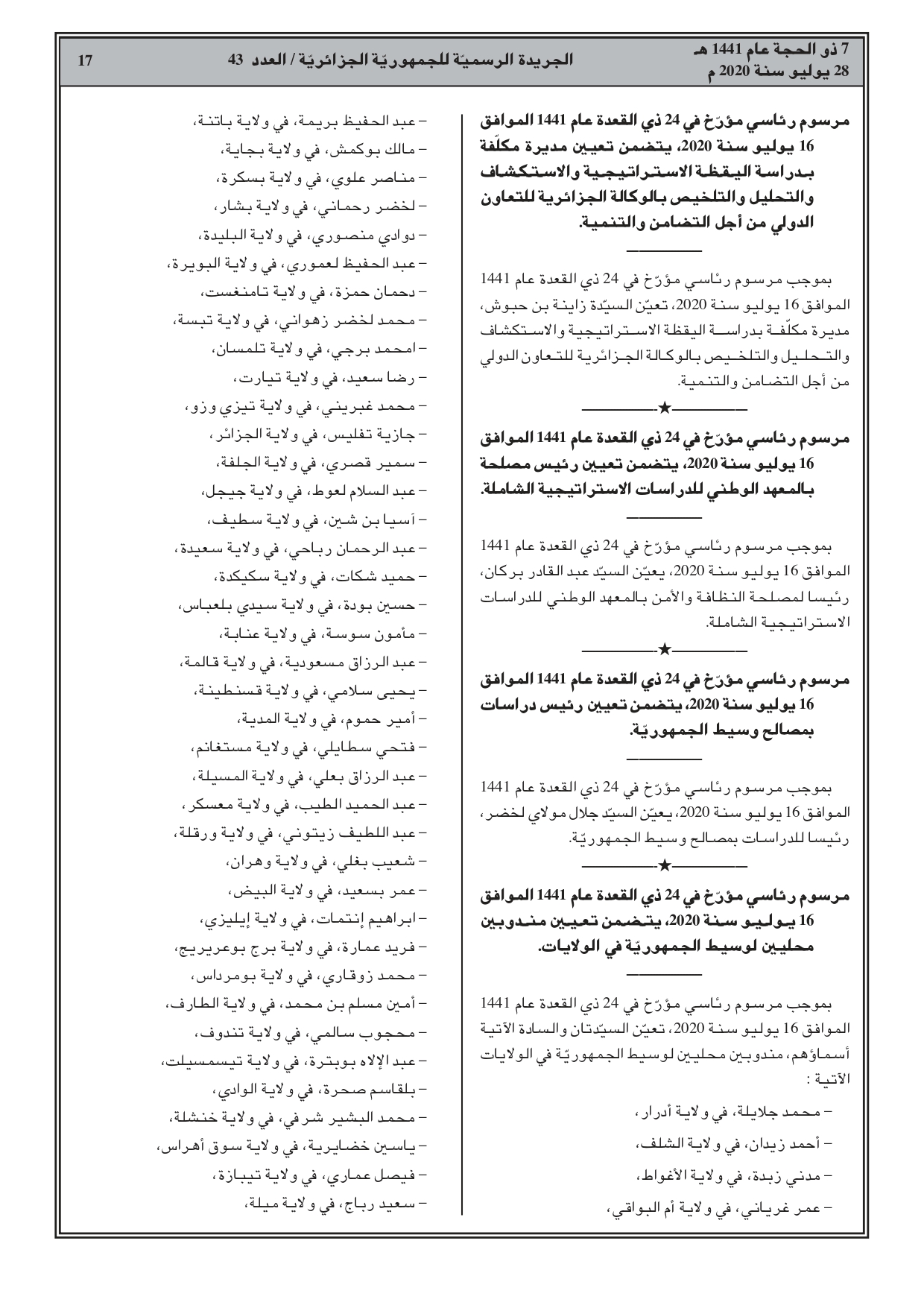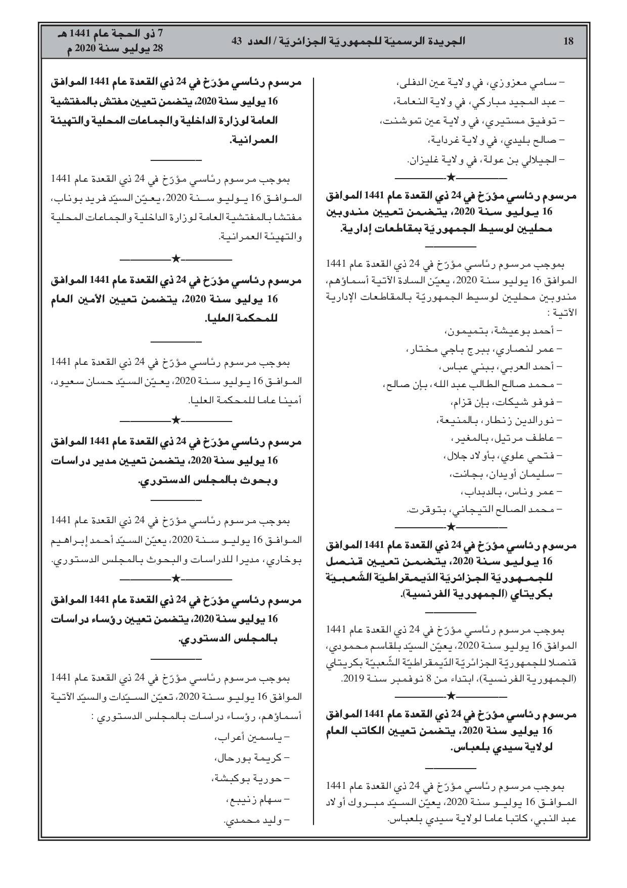 تضمن العدد الأخير من الجريدة الرسمية (43) مرسوما رئاسيا مؤرخا في 24 دي القعدة 1441هـ الموافق ل 16 جويلية 2020 ، تعيين مندوبين محليين لوسيط الجمهورية بالولايات.