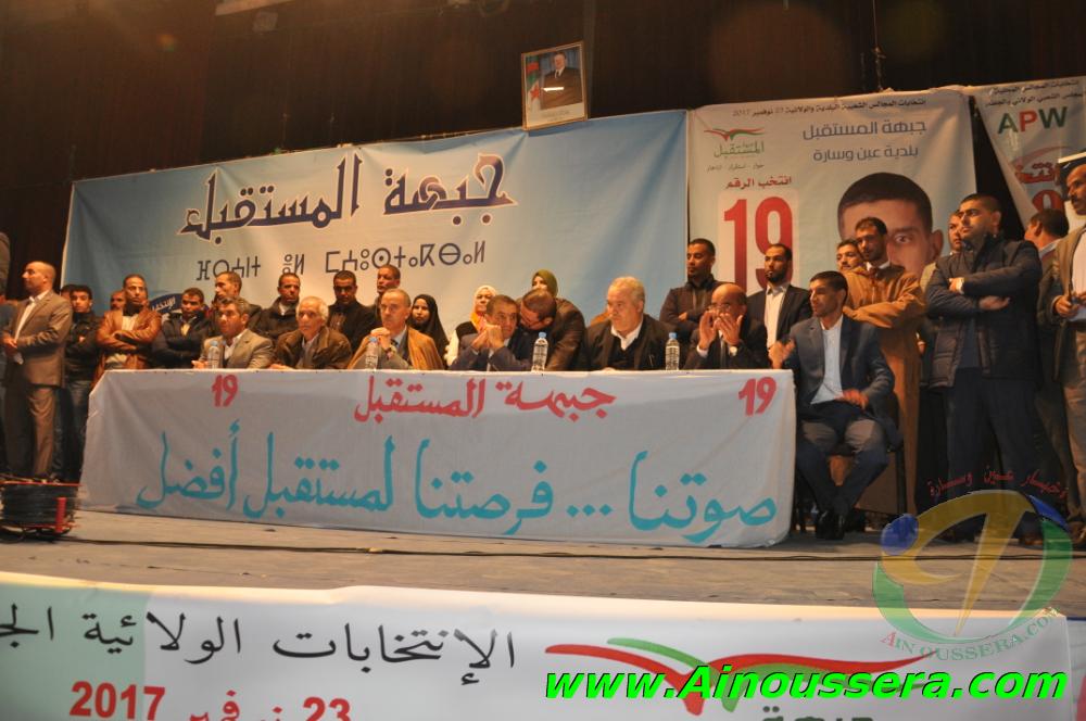 نشط أمسية اليوم رئيس حزب جبهة المستقبل السيد ” عبد العزيز بلعيد ” تجمعا شعبيا بقاعة السينما بعين وسارة في اطار الحملة الانتخابية لمحليات 23نوفمبر 2017 ، حضره المترشحون ضمن قوائم الحزب للمجالس البلدية لبلديات عين وسارة ، بنهار ، الخميس ، بويرة الأحداب والمجلس الشعبي الولائي وجمع كبير من المواطنين.