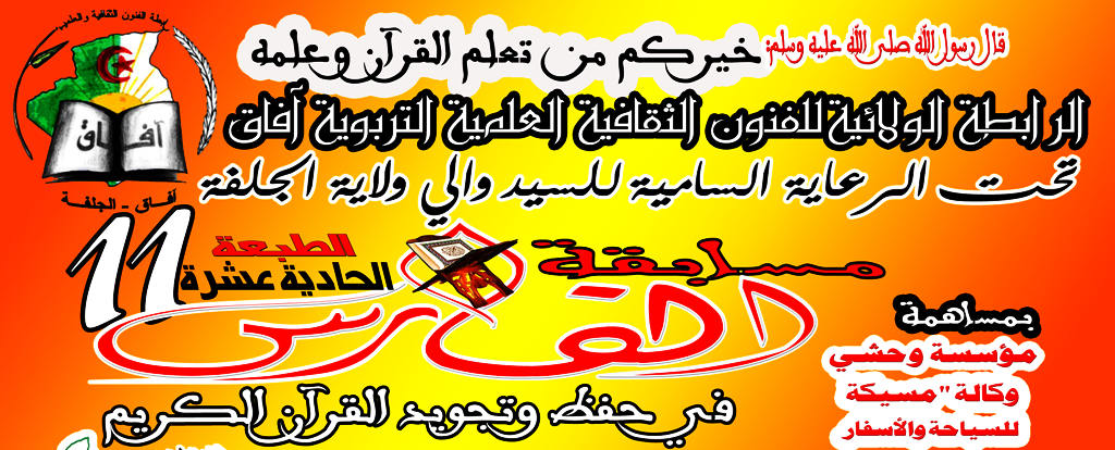 One thought on “رابطة آفاق للفنون الثقافية العلمية التربوية بالجلفة تُطلق الطبعة الـ11 لمسابقة الفارس للقرآن الكريم من عين وسارة.”
