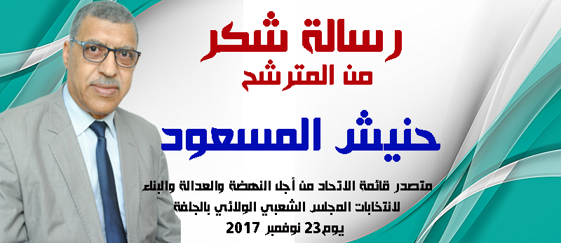 اما بعد أتوجه بجزيل الشكر إلى كل من وضع ثقته في شخصي أو في قائمتي قائمة الاتحاد من أجل النهضة والعدالة والبناء في انتخابات المجلس الشعبي الولائي لولاية الجلفة يوم 23 نوفمبر ، حيث لم نتمكن من بلوغ النسبة المطلوبة لعضوية المجلس الولائي والخير فيما اختاره الله.