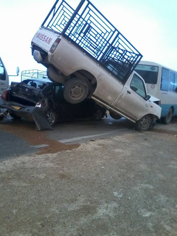 من جهة أخرى تم اصطدام مجموعة من المركبات في الطريق الرابط بين بلديتي بنهار والبيرين وذلك بسبب السرعة المفرطة وانعدام الرؤية بفعل الزوابع الرملية التي اجتاحت المنطقة حيث تسببت هذه الحوادث في خسائر مادية جسيمة دون تسجيل خسائر في الأرواح.