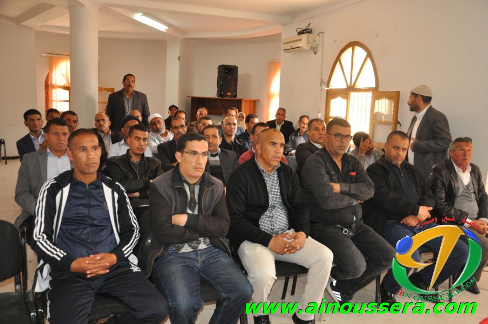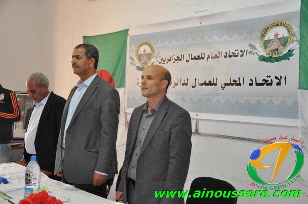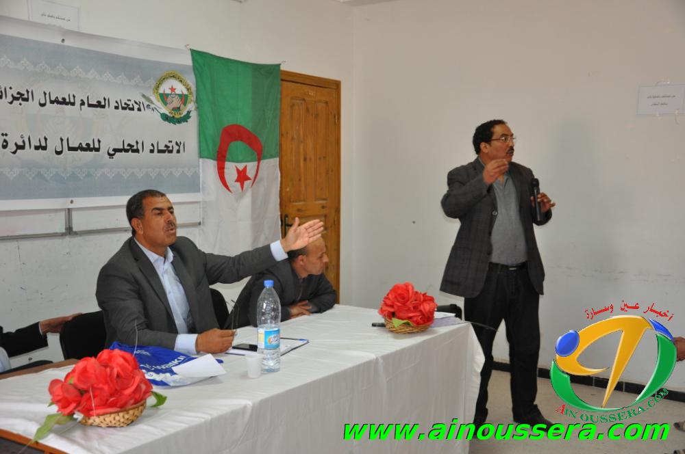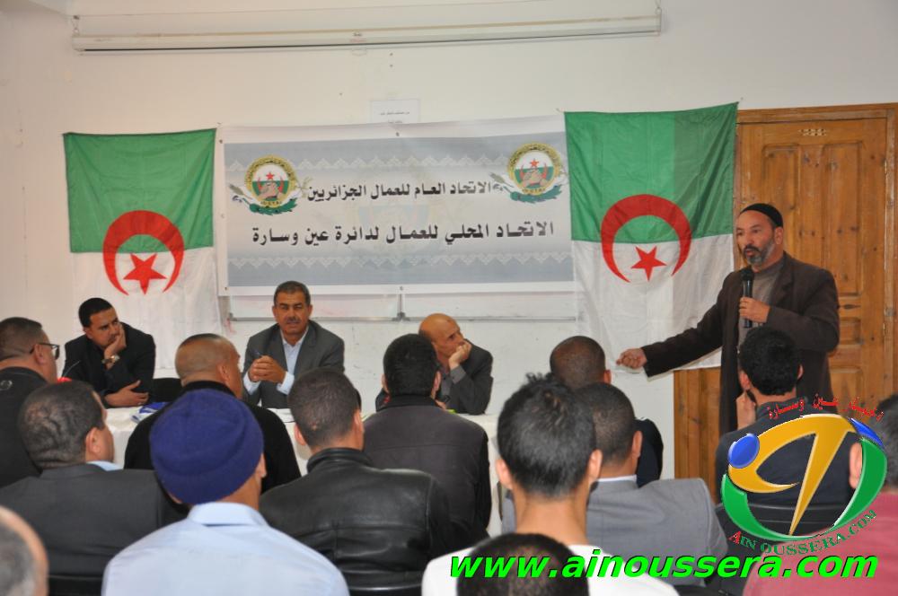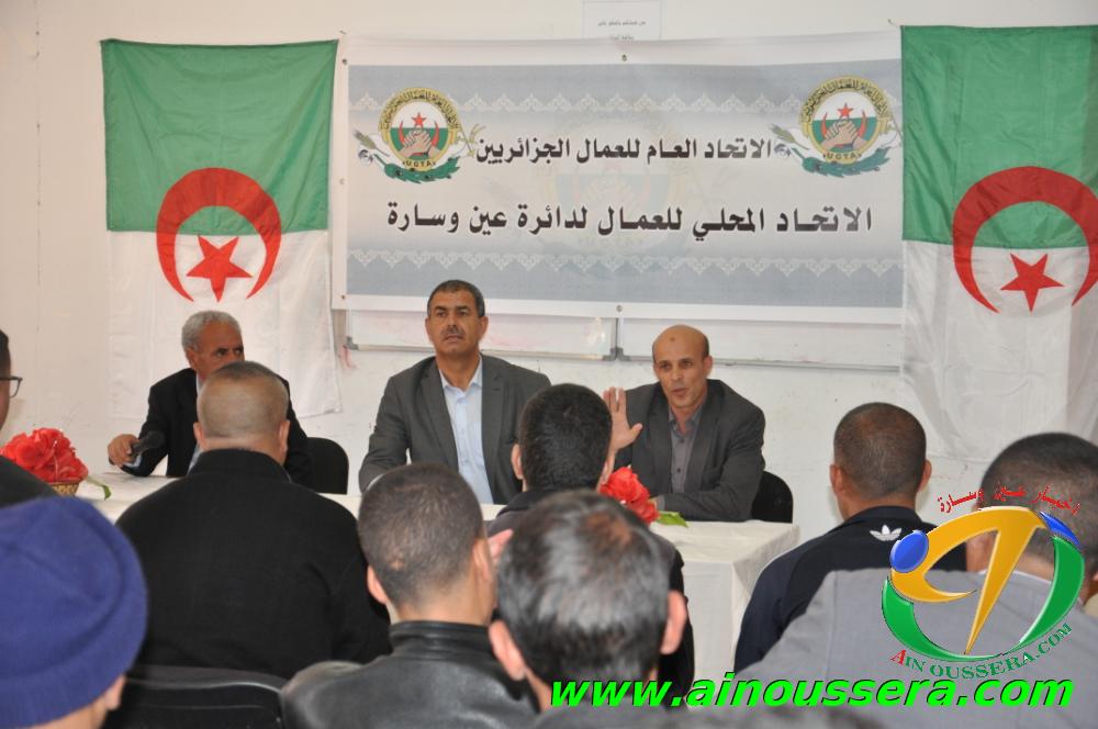 عقد صبيحة اليوم الاتحاد المحلي للاتحاد العام للعمال الجزائريين اجتماعا تنسيقيا احتضنته مكتبة المطالعة العمومية بعين وسارة وحضره رؤساء الفروع النقابية مختلف المؤسسات والادارات العمومية والخاصة بدائرة عين وسارة ونشطه كل من السيد ” مليحي المختار ” عضو الامانة الولائية للاتحاد العام للعمال الجزائريين UGTA وامين الفرع المحلي للاتحاد السيد ” لحول الجيلالي “.