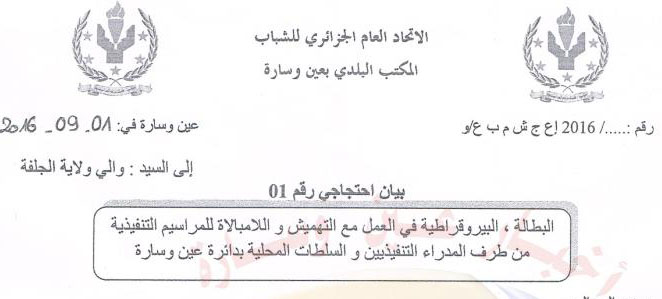 ” البطالة ، البيروقراطية في العمل واللامبالاة للمراسيم التنفيذية من طرف المدراء التنفيذيين والسلطات المحلية بدائرة عين وسارة ” هي عنوان لبيان احتجاجي حرره المكتب البلدي للاتحاد العام للشباب الجزائري ، والذي تحصلت ” أخبار عين وسارة “على نسخة منه ، حيث يتضمن المطالبة بايفاد لجنة تحقيق ممثلة لكافة الأطراف المتعلقة بقضايا الشغل من أجل الوقوف على كيفيات التشغيل .