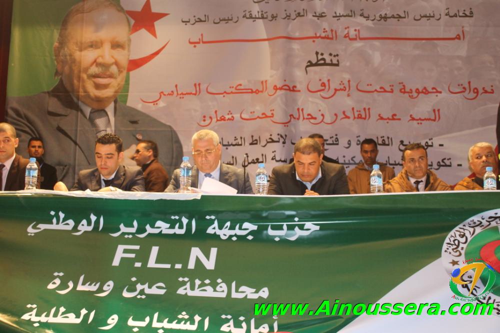 احتضنت قاعة سينما عين وسارة صبيحة اليوم الملتقى الجهوي للشباب الذي ينظمه حزب جبهة التحرير الوطني بين 09 فيفري و 27 مارس 2016 ، حيث أشرف السيد ” عبد القادر زحالي ” عضو المكتب السياسي للحزب والمكلف بأمانة الشباب على تأطير هذا اللقاء الذي يهدف لشرح مضامين الدستور فيما يخص المجلس الاعلى للشباب وتفعيل لائحة انتشار الحزب وذلك بحضور محافظي و شباب محافظات : عين وسارة ، الجلفة ، مسعد ، آفلو ، الأغواط ، قصر البخاري ، بني سليمان ، المدية ، بوسعادة و المسيلة.