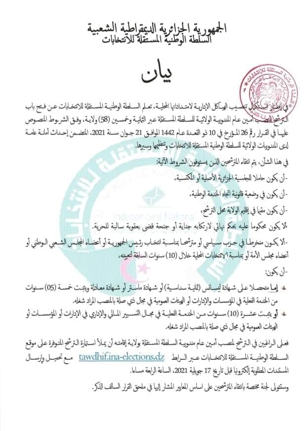 أعلنت السلطة الوطنية المستقلة للانتخابات عن فتح باب الترشح لمنصب أمين عام المندوبية الولائية للسلطة المستقلة عبر 58 ولاية ، وللاطلاع أكثر على تفاصيل المنصب والشروط الواجب توفرها اضغط على الرابط التالي: https://tawdhif.ina-elections.dz/