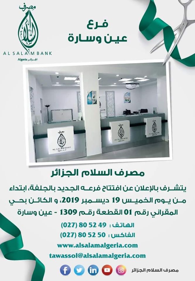 يواصل مصرف السلام تنفيذ استراتيجيته الطموحة الخاصة بالتوسع ، و الانتشار الجغرافي، حيث تم نهار اليوم 19 ديسمبر 2019 افتتاح فرعه بعين وسارة ، بحي المقراني بالمخرج الغربي للمدينة وذلك بحضور المدير العام لمصرف السلام السيد ” ناصر حيدر ” ورئيس المجلس الشعبي البلدي ومدير الشؤون الدينية والأوقاف لولاية الجلفة .