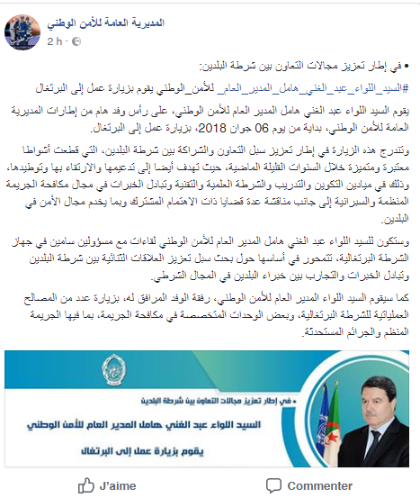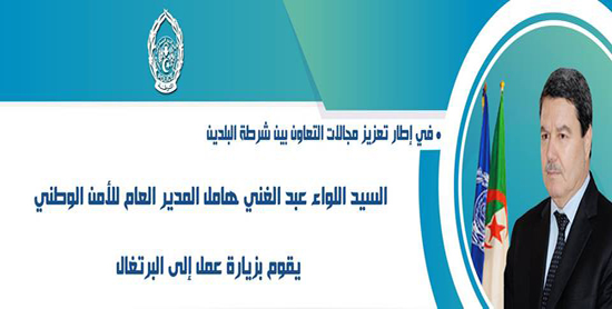 يقوم السيد اللواء عبد الغني هامل المدير العام للأمن الوطني، على رأس وفد هام من إطارات المديرية العامة للأمن الوطني، بداية من يوم 06 جوان 2018، بزيارة عمل إلى البرتغال.