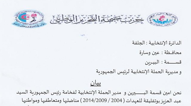 تحصلت الجريدة الالكترونية ” أخبار عين وسارة ” على بيان موقع من قبل أمين قسمة حزب جبهة التحرير الوطني بالبيرين والذي تضمن شكوى مقدمة لرئيس الجمهورية ورئيس حزب جبهة التحرير الوطني السيد ” عبد العزيز بوتفليقة ” والأمين العام للحزب السيد ” جمال ولد عباس ” من أجل أخذ مترشحي البيرين بعين الاعتبار في القوائم الانتخابية الخاصة بالتشريعيات المقبلة والمجالس الشعبية الولائية خاصة بعدما تم اقصاء أبناء هذه المنطقة في الاستحقاق الماضي.