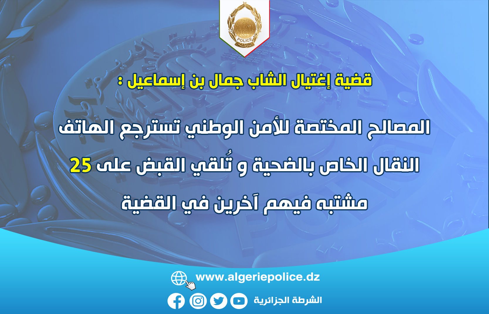 مواصلة للتحقيقات التي باشرتها المديرية العامة للأمن الوطني في قضية إغتيال الشاب جمال بن إسماعيل بمدينة الأربعاء نايث إيراثن بولاية تيزي وزو، تمكنت مصالحها المختصة وباستعمال التقنيات الحديثة، من استرجاع الهاتف النقال ملك للضحية.