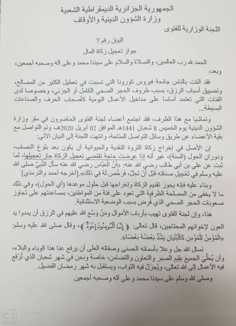 وتماشيا مع هذا الظرف، فقد اجتمع أعضاء لجنة الفتوى الحاضرون في مقر وزارة الشؤون الدينية يوم الخميس 8 شعبان 1441هـ الموافق 02 أبريل 2020هـ، وتم التواصل مع بقية الأعضاء عن طريق وسائل التواصل المتاحة، وانتهت اللجنة إلى البيان الآتي: