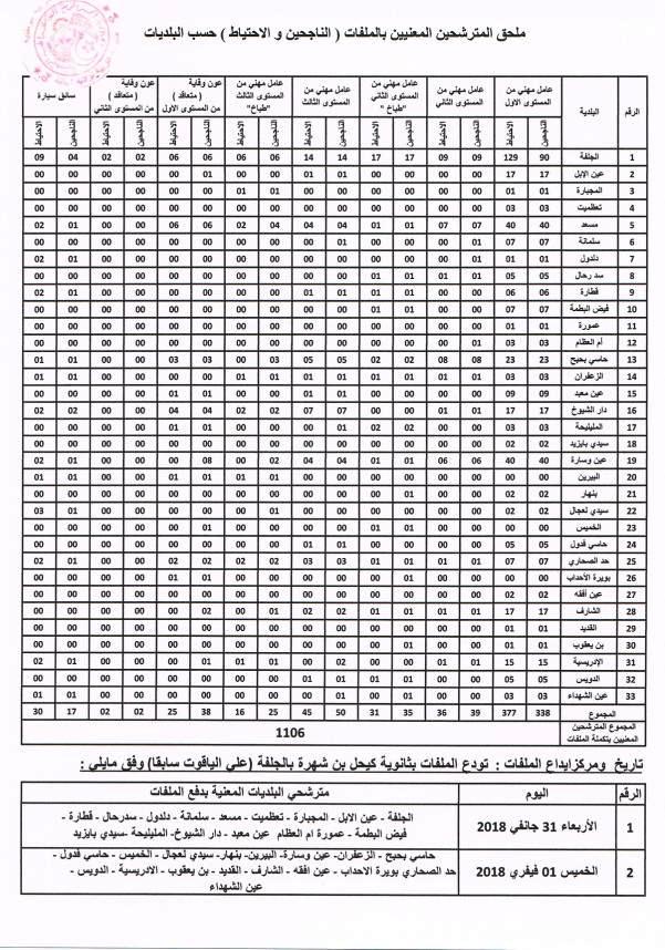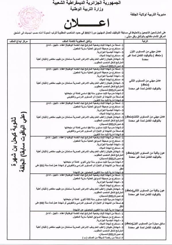 دعت مديرية التربية بولاية الجلفة عبر موقعها الالكتروني كافة الناجحين والاحتياطيين في مسابقة العمال المهنيين بعنوان 2017 ضرورة تكملة ملفاتهم حسب البلديات في الملحق المرفق وفق ما يلي: