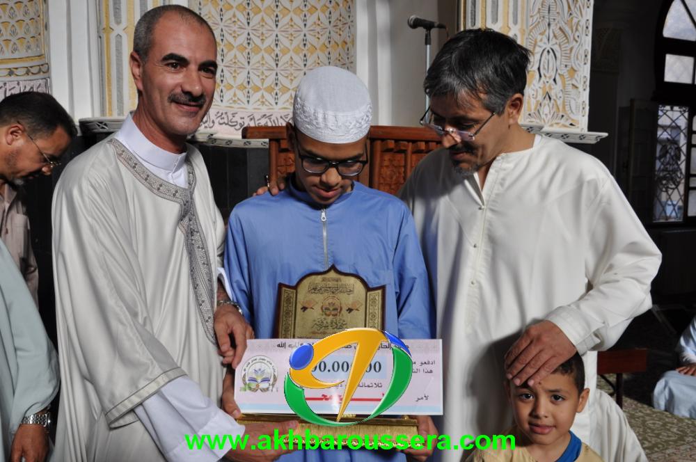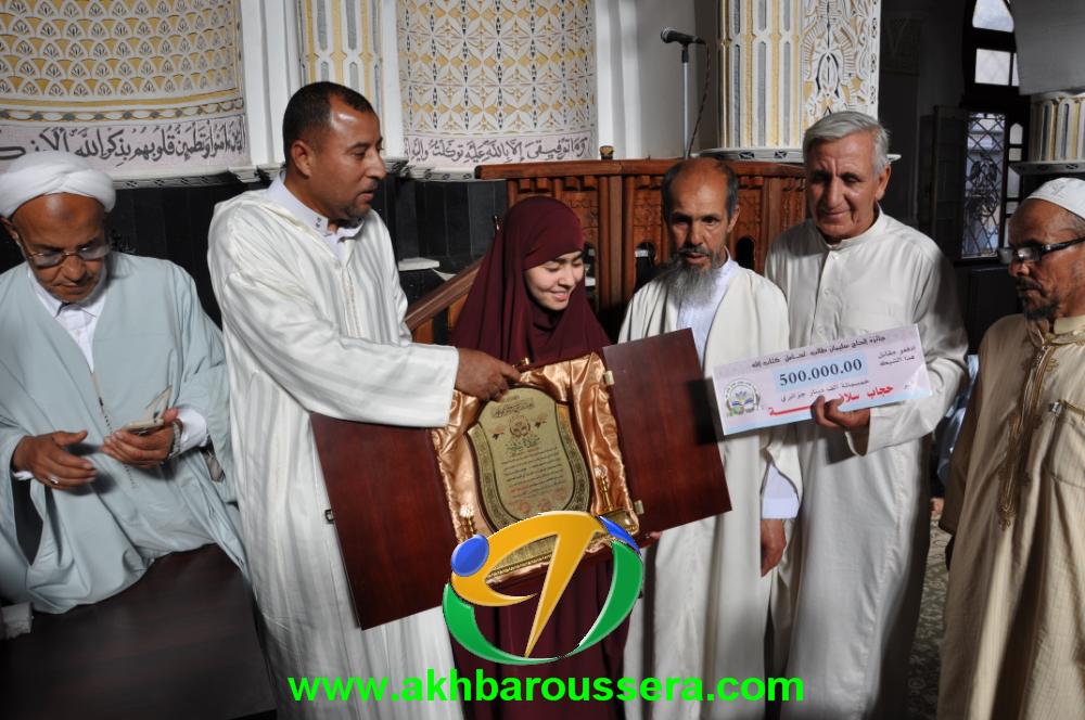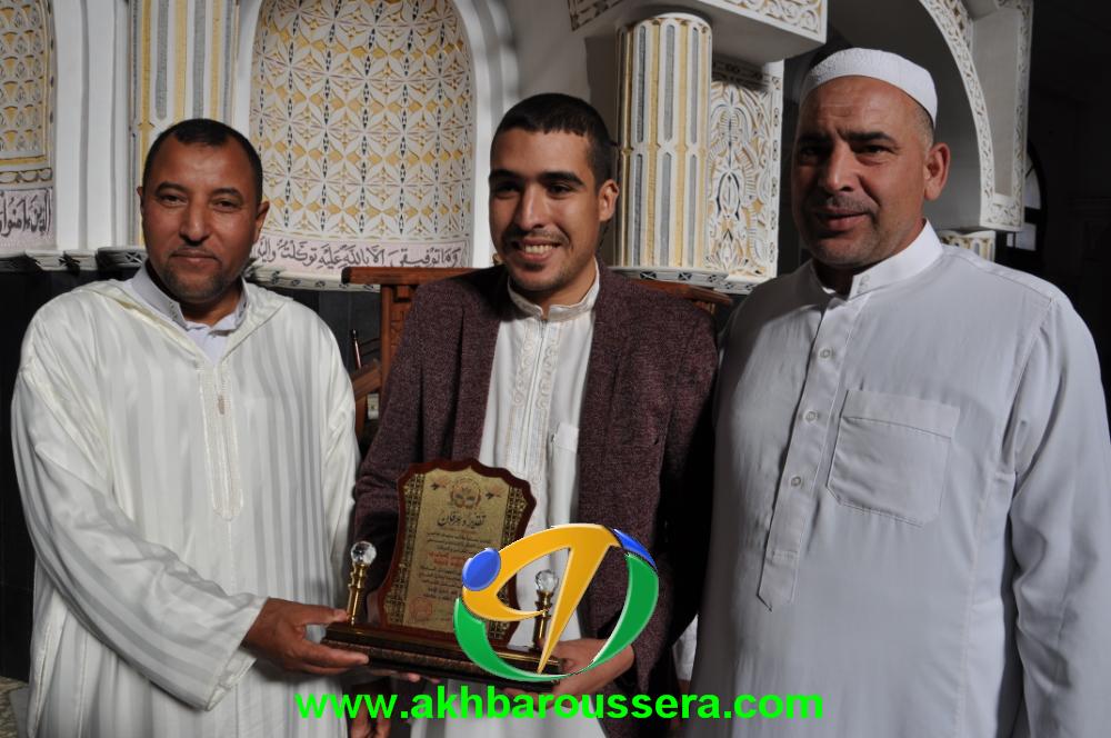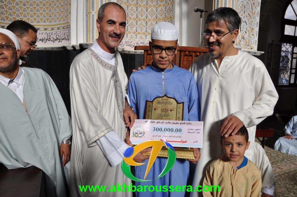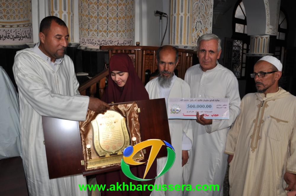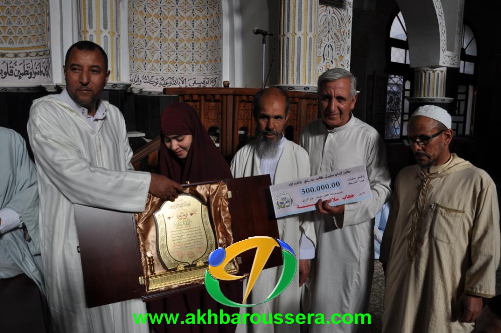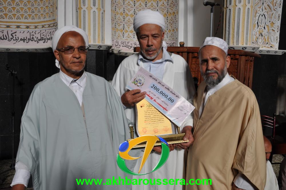 ليتم في ختام الحفل تكريم الطالبة ” حجاب سلافة ” من بلدية عين وسارة ،الحائزة على المرتبة الأولى في المسابقة من قبل السيد ” مفتاح شدادي ” مدير الشؤون الدينية بمعية السيد ” طالب رابح ” وهو أخ المرحوم سليمان طالب الذي سلمها درع التكريم وشيك بمبلغ 50 مليون سنتيم ، كما تم تكريم الحائز على المرتبة الثانية الطالب ” صولح محمد ” من بلدية الجلفة بمبلغ 30 مليون سنتيم من قبل السيد ” شريف خويل ” مفتش بمديرية الشؤون الدينية بمعية السيد ” طالب عبد الباقي ” وتكريم الطالب ” سليم يوسف ” من بلدية الجلفة بمبلغ 20 مليون سنتيم من قبل معتمد دائرة عين وسارة الشيخ ” بعيطيش عبد الرحمان ” بمعية الامام ” خير العيد ” .