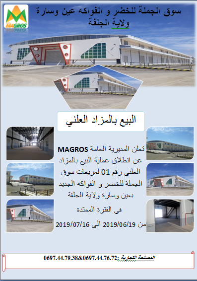 أعلنت المؤسسة العمومية الإقتصادية “Magros”، أنها كلفت مؤسسة “ماقرو الونشريس” لولاية عين الدفلى، عن تنظيم عمليات المزاد العلني لبيع مربعات السوق الجهوي للجملة الجديد للخضر والفواكه بعين وسارة ولاية الجلفة، حيث أبلغت المؤسسة الراغبين بالمشاركة، أن عملية المزاد العلني رقم 01/2019 انطلقت يوم الأربعاء 19/06/2019، وتستمر إلى غاية 16/07/2019.