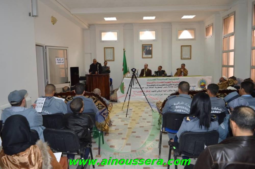 بمناسبة اليوم الوطني للشهيد المصادف لـ 18 فيفري من كل سنة وتحت الرعاية السامية لفخامة رئيس الجمهورية المجاهد عبدالعزيز بوتفليقة وتعليمات السيد المدير العام للجمارك ، نظمت مفتشية الأقسام للجمارك بالجلفة ندوة تاريخية بالمناسبة اشرف عليها السيد رئيس مفتشية الأقسام للجمارك بالجلفة بالنيابة المفتش العميد ” بلعطرة مفتاح ” وبالتنسيق مع المدير الولائي للمجاهدين بالجلفة السيد ” محمد عباس شريف ” والأمين الولائي لمنظمة المجاهدين بالجلفة المجاهد ” جقبوب بن عبدي ” ورئيس جمعية معطوبي حرب التحرير والأسرة الثورية يتقدمهم المجاهد قشام بن علية والأسرة الإعلامية واساتذة في التاريخ واحد شعراء المنطقة.