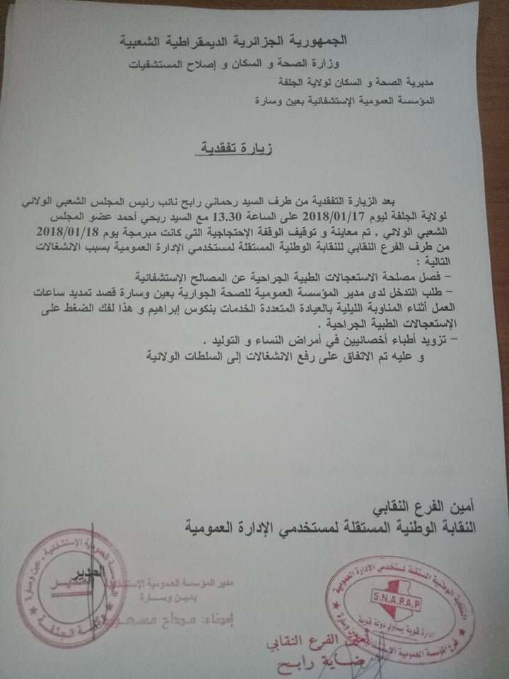 وبعد جلسة عمل ونقاش جمعت نائب رئيس المجلس الشعبي الولائي بالجلفة ” رابح رحماني ” والنائب ” ربحي أحمد ” ومدير المؤسسة العمومية الاستشفائية ” مداح المسعود ” وممثلي النقابات ، تعهد السيد ” رابح رحماني بنقل جملة مطالبهم للسلطات الولائية والعمل على متابعتها وايجاد حلول لها.