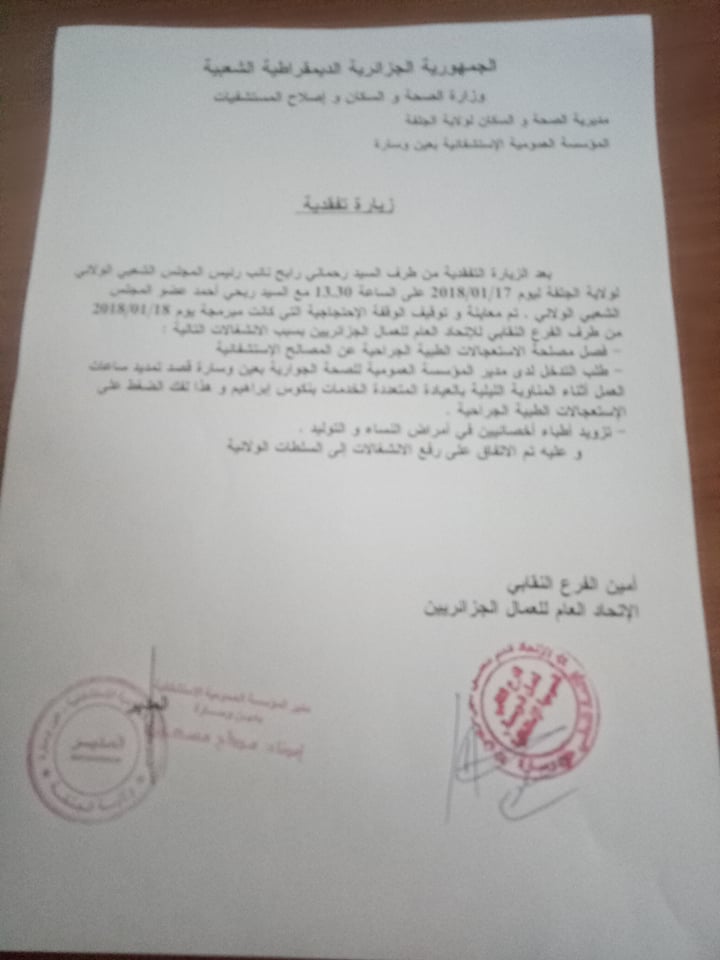 الوقفة التي كان سينظمها الفرع النقابي للنقابة الوطنية المستقلة لمستخدمي الادارة العمومية والفرع النقابي للاتحاد العام للعمال الجزائريين جاءت لطرح جملة من الانشغالات والمطالب التي تحتاجها المؤسسة العمومية الاستشفائية المجاهد ” سعداوي المختار ” وهي كالاتي: