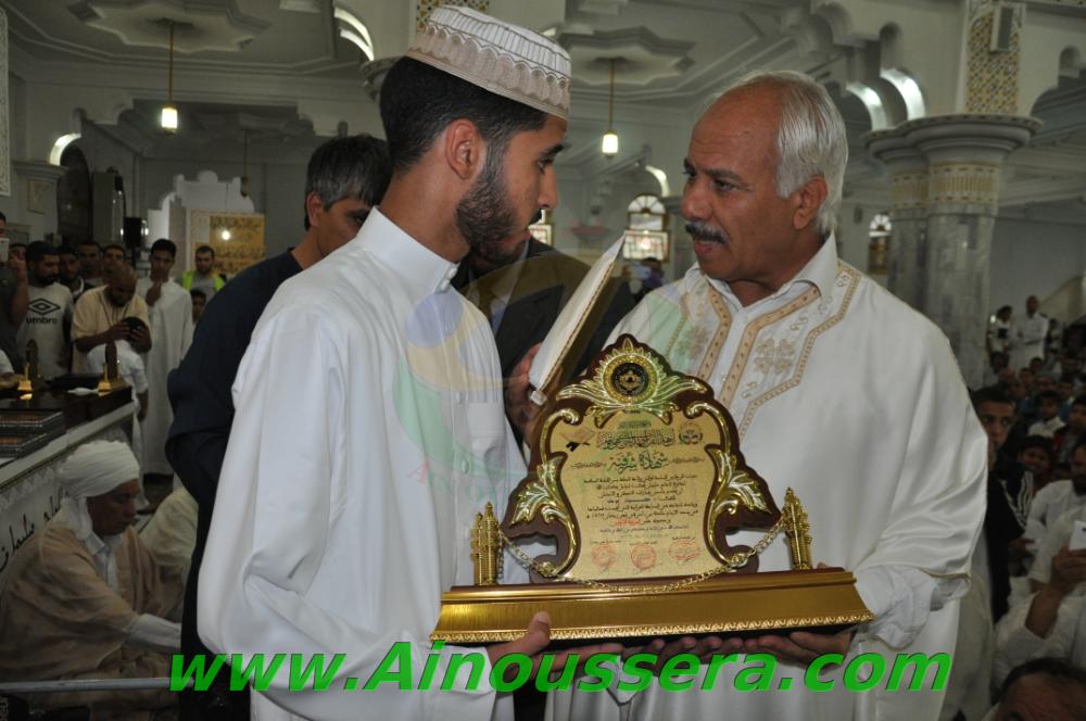 ليتم في ختام الحفل تكريم الطالب ” مطيار يوسف ” من بلدية عين وسارة ،الحائز على المرتبة الاولى في المسابقة من قبل السيد والي الولاية الذي سلمه درع التكريم ومبلغ (500.000 د.ج ) 50 مليون سنتيم ، كما تم تكريم الحائز على المرتبة الثانية الطالب ” صكصك محمد ”  من بلدية تعظميت بمبلغ ( 300.000 د.ج ) 30 مليون سنتيم وتكريم الطالب ” قاسمي ياسين ” من بلدية حاسي بحبح بمبلغ ( 200.000 د.ج ) 20 مليون سنتيم ، وتكريم معلم الطالب ” مطيار يوسف ” بتذكرة سفر للبقاع المقدسة لآداء مناسك عمرة كاملة التكاليف.