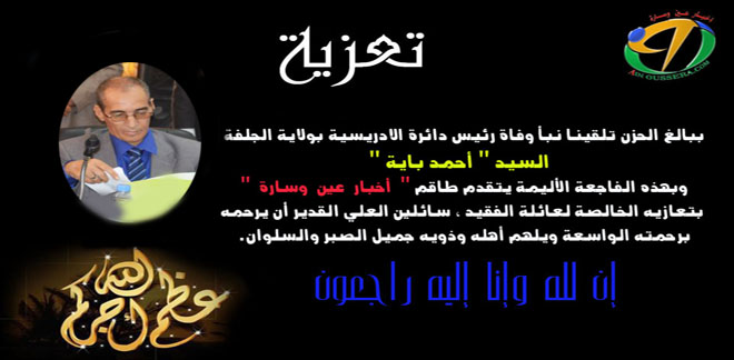 توفي صبيحة اليوم رئيس دائرة ” الإدريسية ” بولاية الجلفة السيد ” أحمد باية ” عن عمر ناهز 56 سنة بعد مرض عضال ألم به ، والذي تمثل في ارتفاع ضغط الدم الذي داهمه بعد نحو شهرين من تعيينه على رأس دائرة الإدريسية بولاية الجلفة مطلع شهر أكتوبر .
