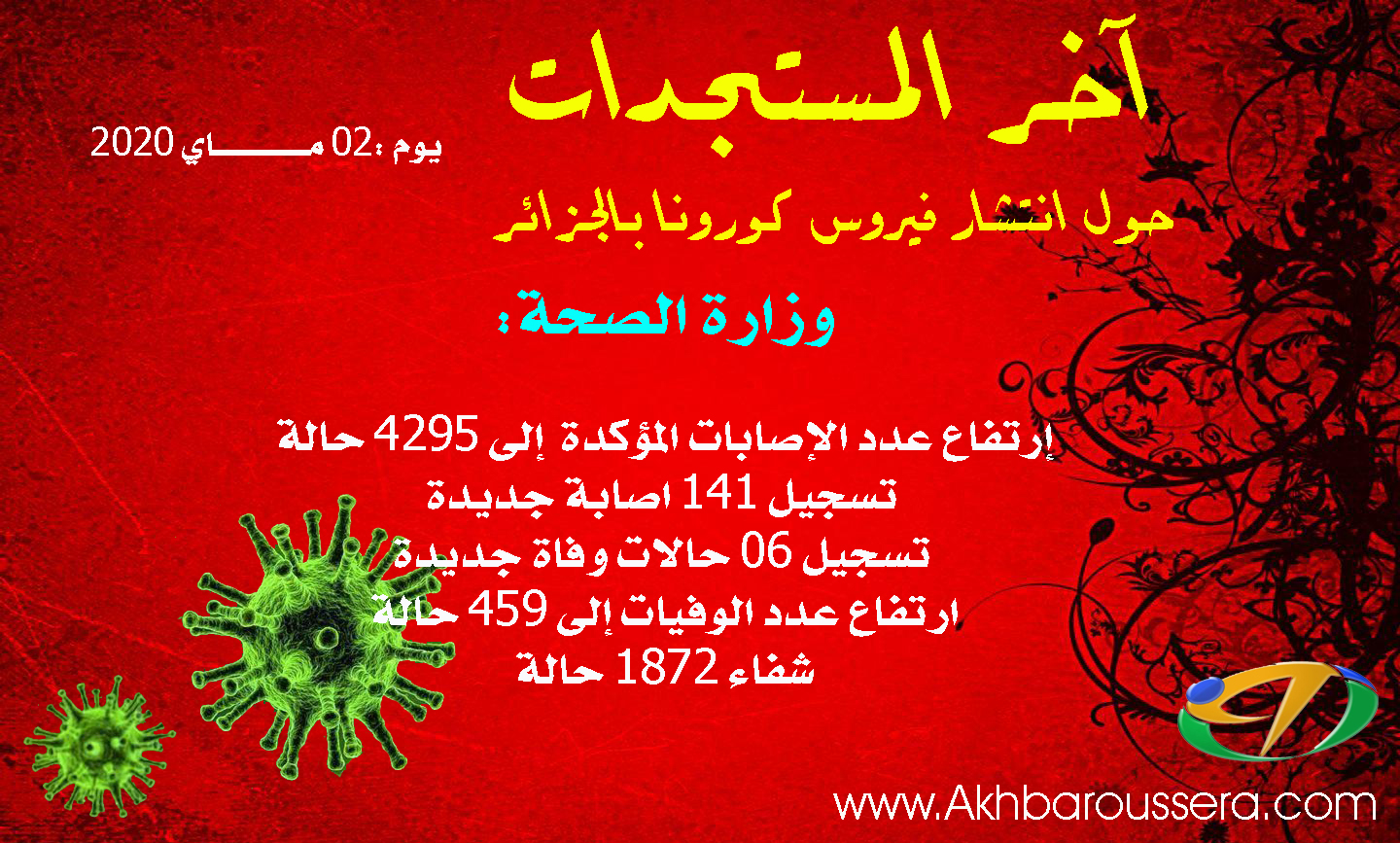 أعلن جمال فورار ، الناطق الرسمي باسم لجنة المتابعة ورصد فيروس كورونا في الجزائر، اليوم السبت، عن تسجيل 141 إصابة جديدة مؤكدة بفيروس كورونا خلال 24 ساعة الأخيرة، ليترتفع العدد الاجمالي للمصابين 4295 حالة إصابة مؤكدة، كما تم تسجيل 6 وفيات ليرتفع الى 459 حالة وفاة ، بينما تم تسجيل 51 حالة شفاء ليرتفع عدد المتعافين الى 1872 حالة.