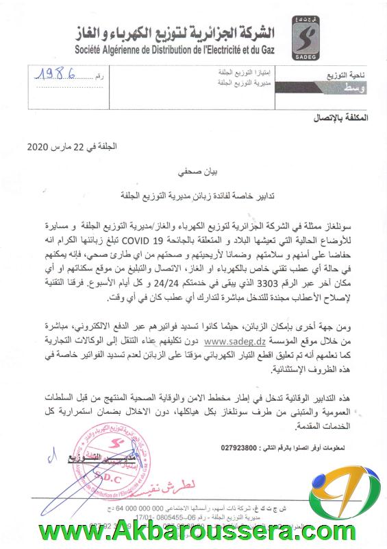 و أمر الوزير الأول، حسب ذات المصدر “الولاة بالعمل تحت اشراف وزير الداخلية و الجماعات المحلية و تهيئة الاقليم و تحت طابع استعجالي بتكليف رؤساء المجالس الشعبية بالقيام ، تحت اشراف رؤساء الدوائر و الولاة المنتدبين حسب الحالة بتنظيم و تأطير الاحياء و القرى و التجمعات السكانية”.